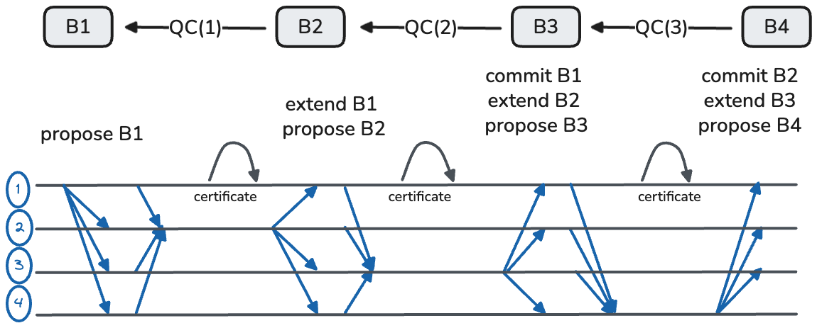. Chaining proposals to one another using cryptographic certificates is utilized along with protocol voting and commit rules to ensure safety.