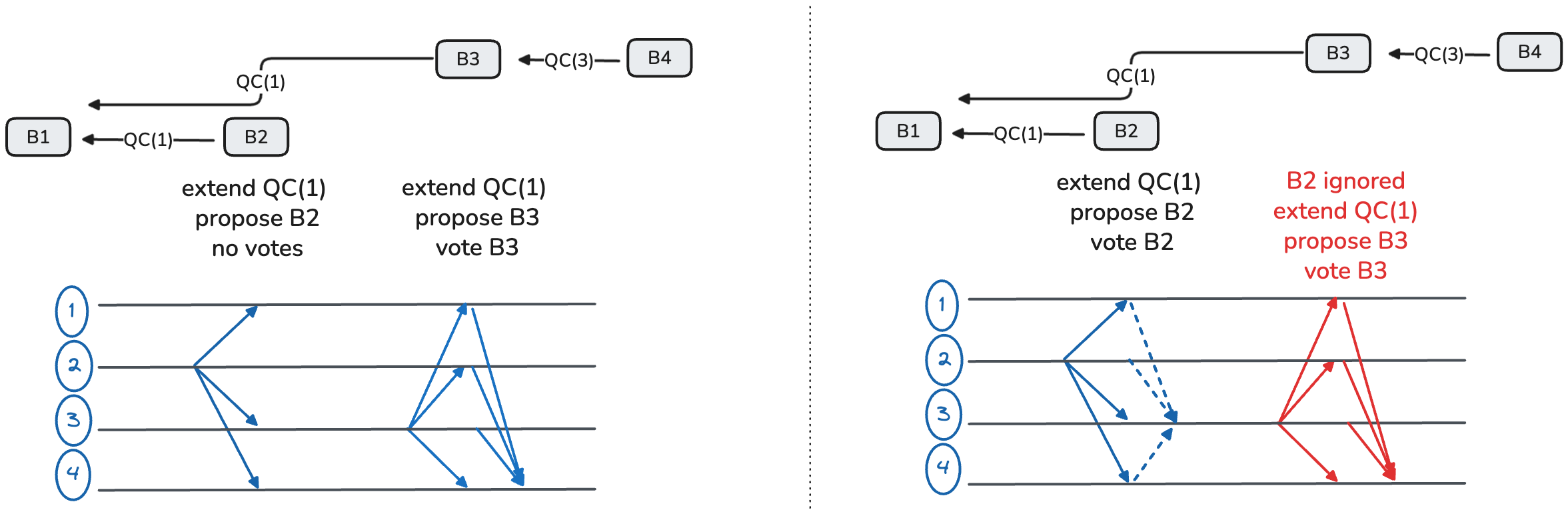 The problem exposed in BeeGees is that previously, HotStuff lets a leader pretend the preceding view failed by ignoring votes for the preceding proposal. Figure 2 below shows how a malicious L_3