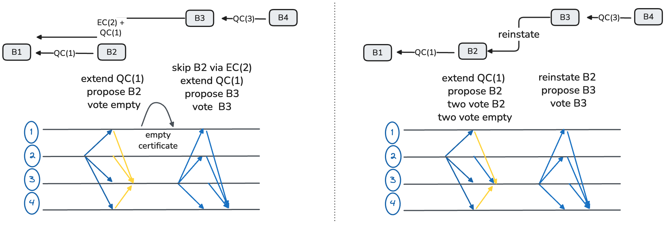reference. Figure 3 shows two scenarios: on left, a justified skip accompanied by an EC; on right, a reinstated, uncertified proposal.