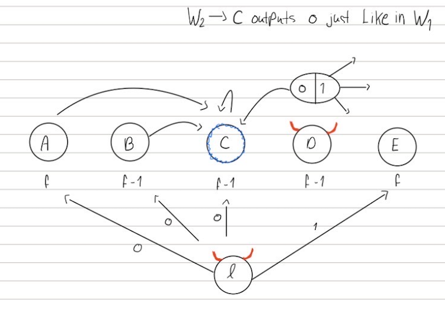 We used world $\hat{D}$ where $D$ is malicious. This choice depends on the decision in world $M$ being 1. In the symmetrical case where the decision is 0, we would use world $\hat{B}$ where $B$ is malicious: it plays as if it has $0$ to $A,D,E$, and it sends round one of voting messages to $C$ as if it has 1.