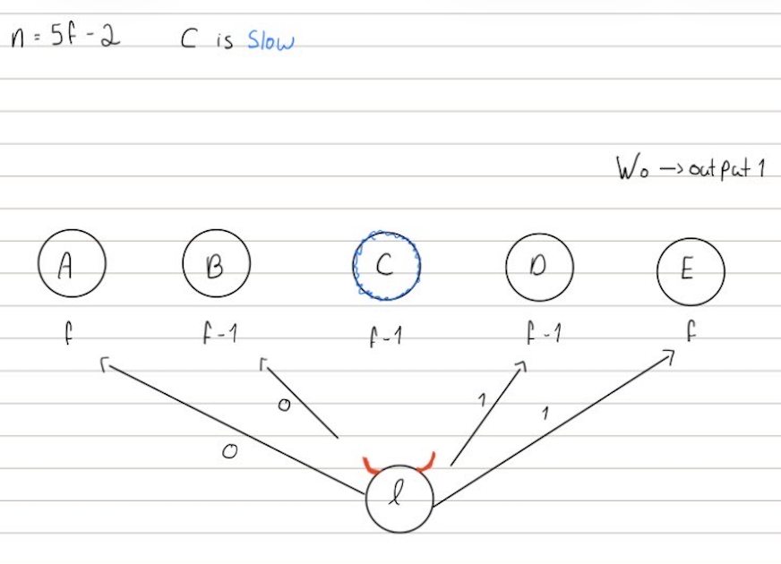 In the mixed world, the leader is Byzantine and the parties in $C$ are slow (crashed). Also, $GST = 0$. The leader sends a mixed signal: $0$ to $A,B$ and 1 to $D,E$.