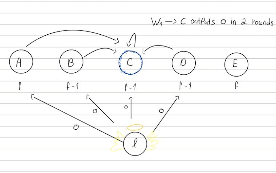 Now we can reach a contradiction by showing that in world $\hat{D}$ where the decision is 1, the set $C$ will see the same messages as in world $V$ and hence decide 0 after two rounds for a safety violation (at least half the time).